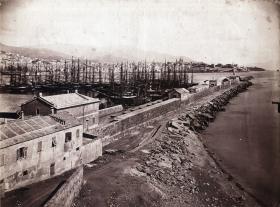 View of the Port of Genoa by photographer Emanuele Lupi, 1875 — showing sailing ships moored along the seawall and the historic Italian city overlooking the harbor.