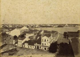 A photograph of Old Recife in 1880 by Moritz Lamberg, showing the historic features of the Brazilian coastal city.