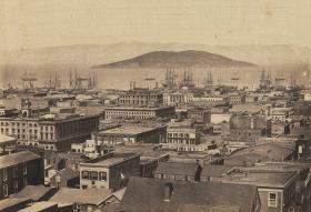 A view of San Francisco in 1856 as seen from Stockton Street, showing the early landscape of the city and its harbor during the mid-19th century.